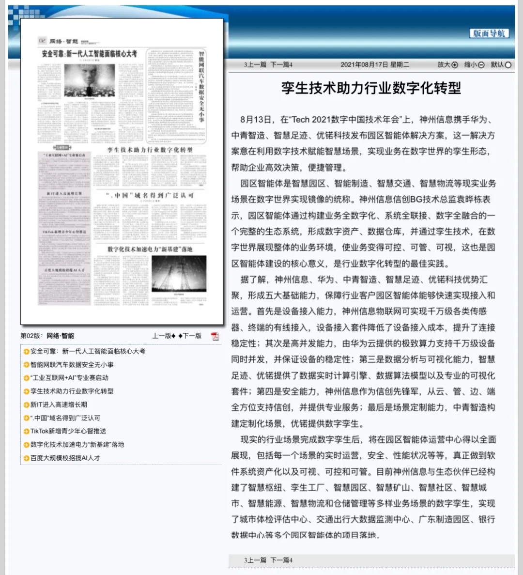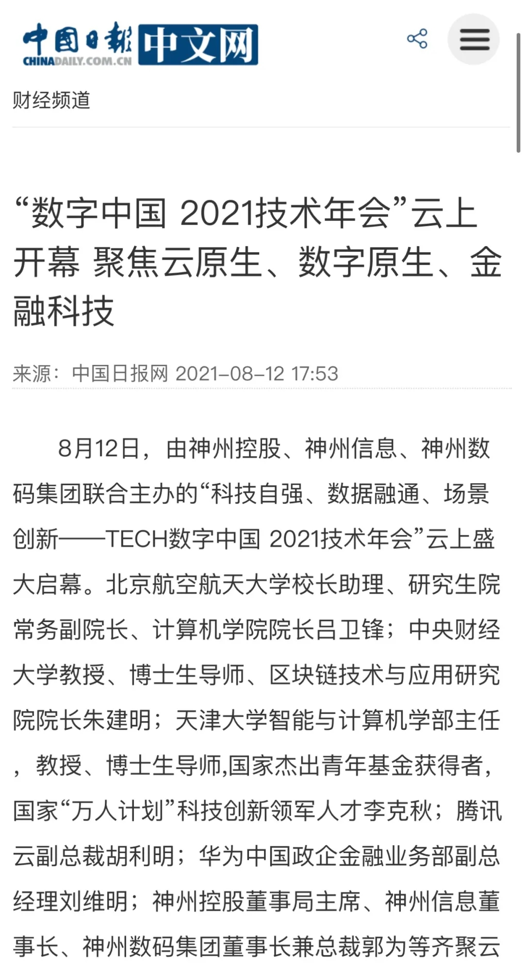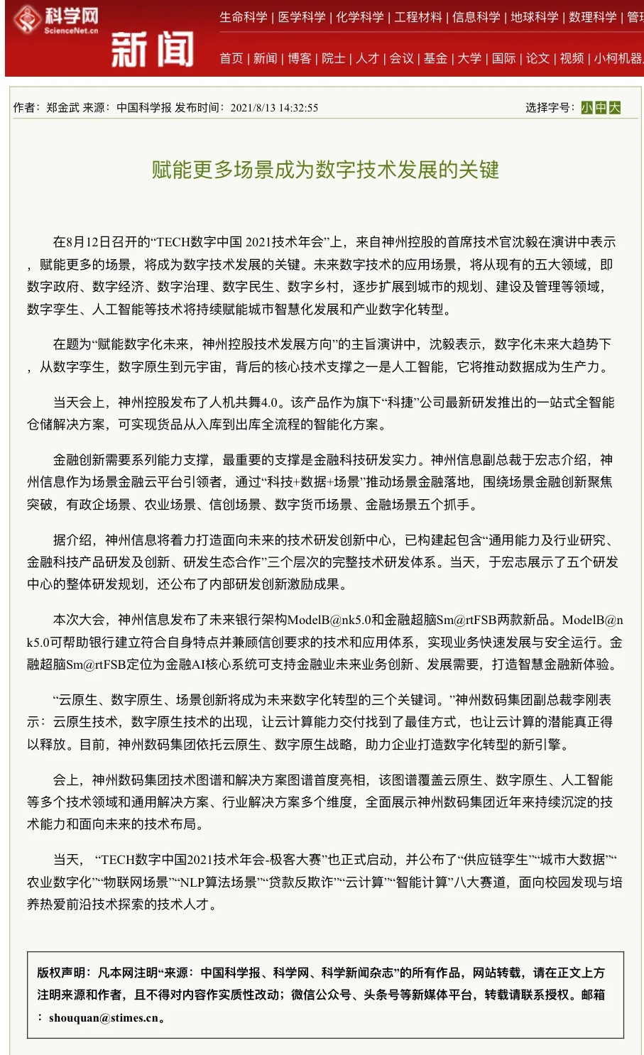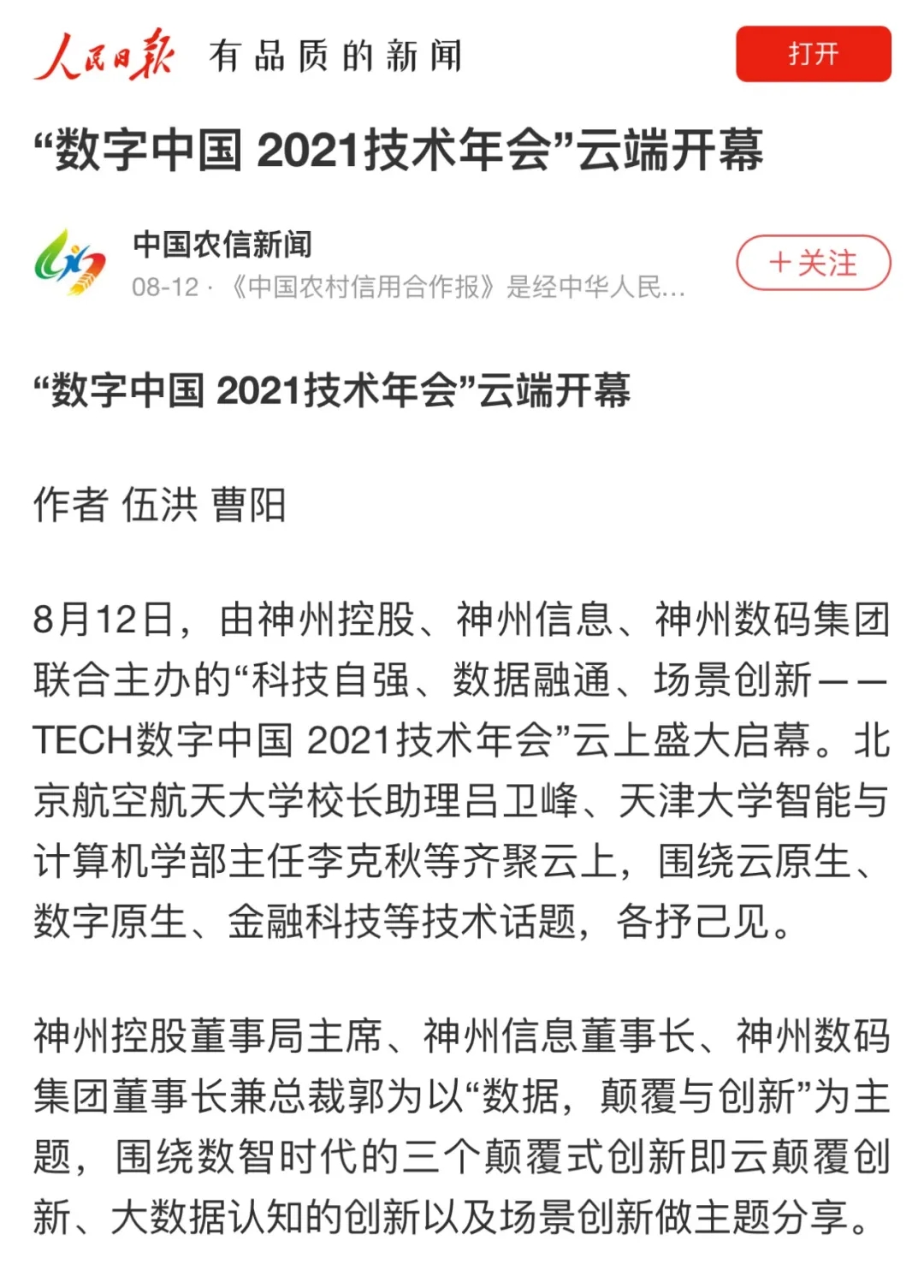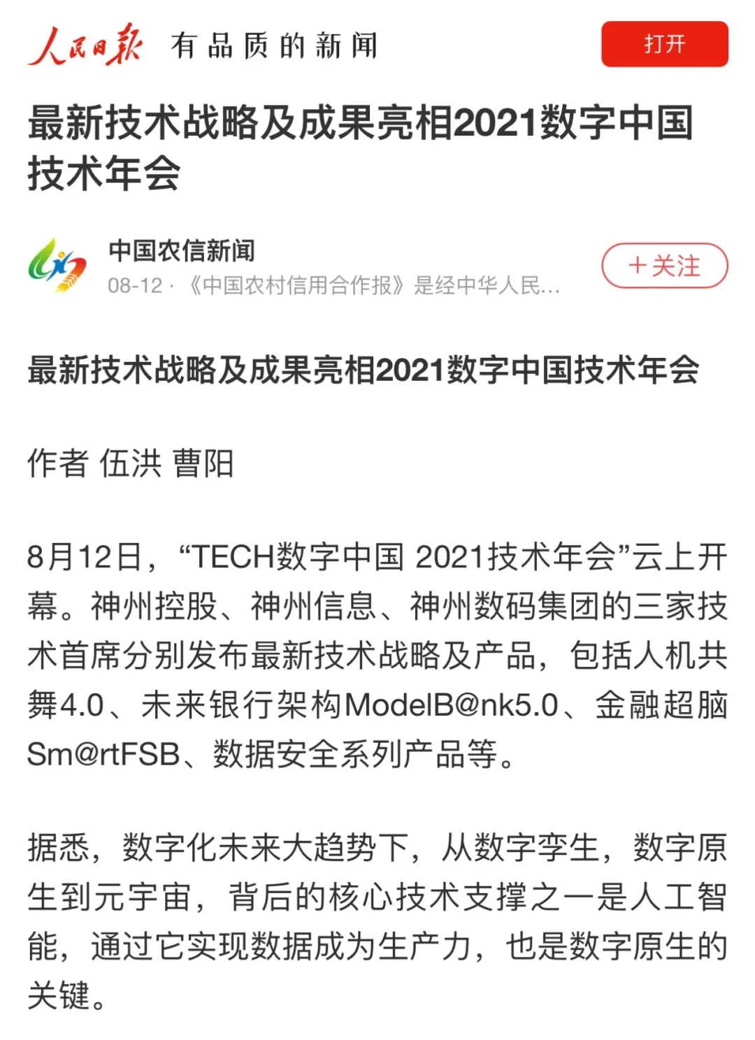 8月12日,由神州控股、神州信息、leyu.com集团联合主办的“科技自强、数据融通、场景创新——TECH数字中国 2021技术年会”云上盛大启幕,发布神州信创云、ModelB@nk5.0、金融超脑Sm@rtFSB、云原生数字化安全底座、园区智能体等重磅产品,国内各大权威、影响力媒体多角度多频次对盛况进行报道!